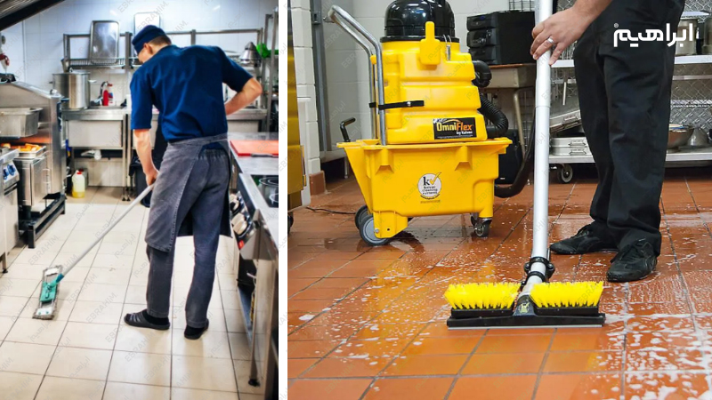| کفپوش محیط آشپزخانه را با روش های مناسب نظافت و ضدعفونی نمایید. | زمین شوی صنعتی و مواد شوینده | |