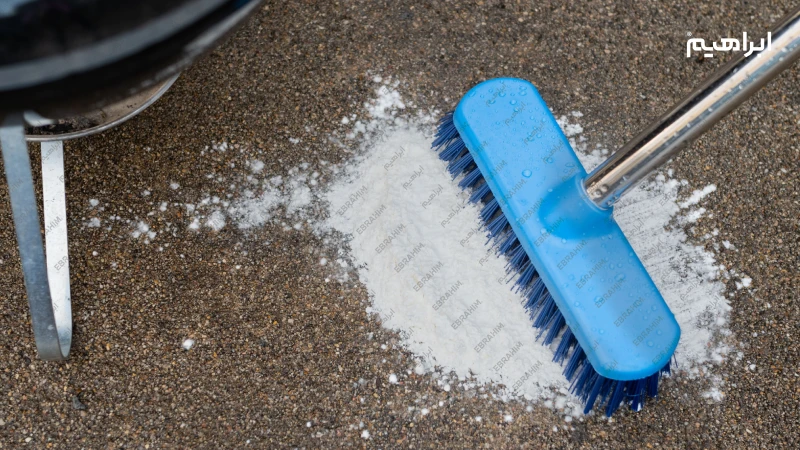 برای شستشوی لکه سیمان خشکشده با استفاده از پودرهای شوینده، ابتدا سطح لکهدار را با آب مرطوب کنید تا سیمان کمی نرم شود. سپس مقدار مناسبی از پودر شوینده را روی لکه بپاشید. با استفاده از یک برس نرم یا اسکاچ پلاستیکی، پودر شوینده را به آرامی روی سطح سیمان بسابید. حرکات دایرهای و یکنواخت انجام دهید تا پودر به خوبی با سیمان مخلوط شود و شروع به حل کردن آن کند.