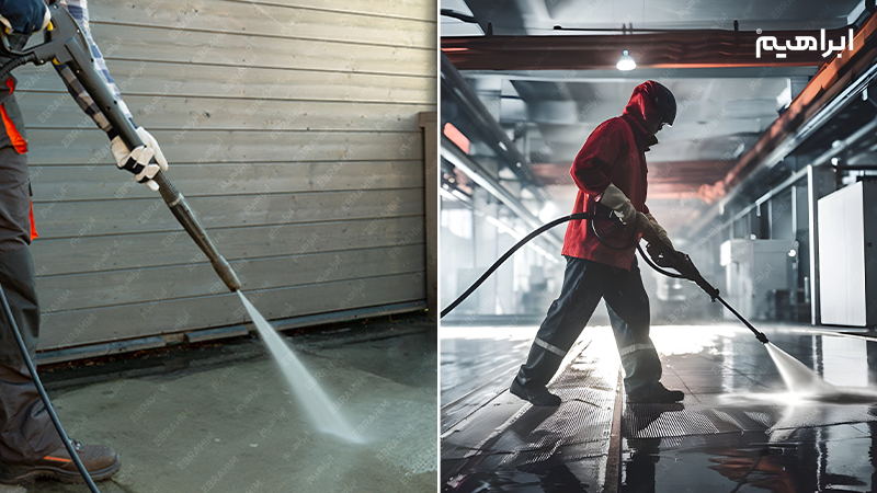 نازلهای مخصوص واترجت صنعتی، جریان آب را به صورت متمرکز یا پاششی (فنشکل) هدایت میکنند تا حداکثر کارایی را در شکستن پیوند آلودگی با سطح اپوکسی داشته باشند. کاربرد اصلی واترجت صنعتی در محیطهایی است که با تجمع مداوم مواد چرب، شیمیایی یا لکههای مقاوم مواجه هستند، مانند کارگاههای مکانیکی، آشپزخانههای صنعتی یا مناطقی که در معرض پاشش مواد قرار دارند. با این حال، استفاده از واترجت بر روی کفپوش اپوکسی نیازمند دقت و مهارت است.