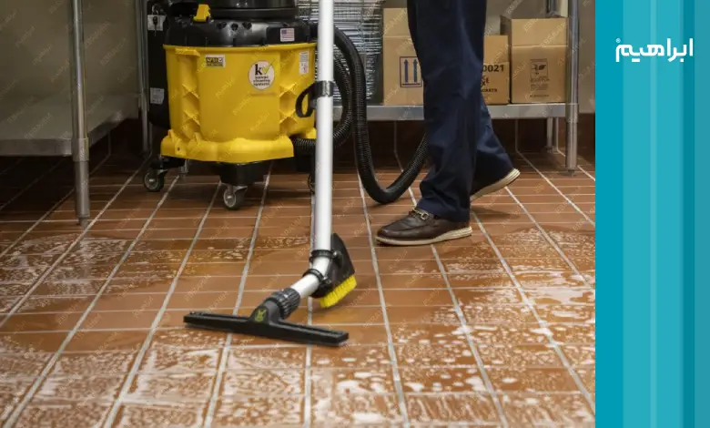 - شستشوی کف (در صورت لزوم): در صورت وجود لکههای چرب یا کثیفی عمیق، کفپوشهای سخت با استفاده از اسکرابر صنعتی یا تی و مواد شوینده مخصوص کف شسته شوند. در صورت وجود فرش، از فرششوی صنعتی برای نظافت عمیق استفاده شود.
