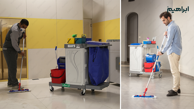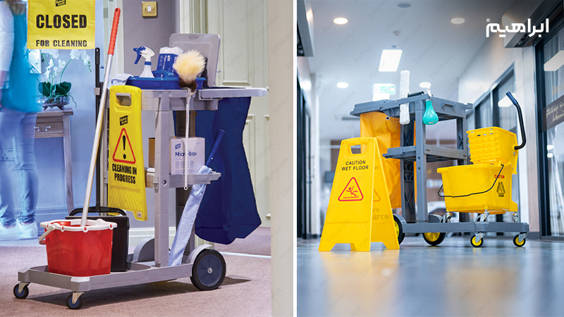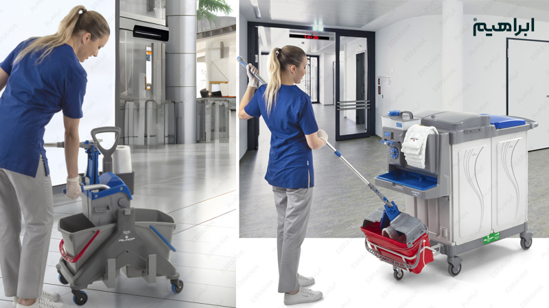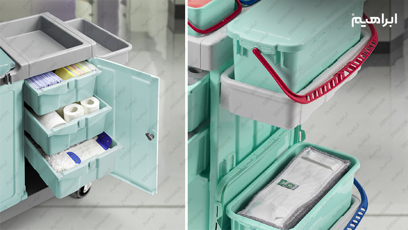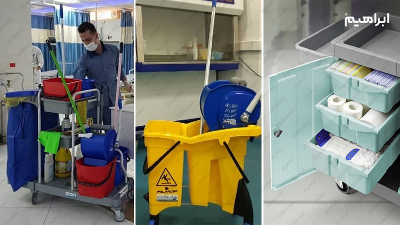 - ترولی نظافت: این ترولی ها برای حمل وسایل مورد نیاز برای نظافت بیمارستان استفاده می شوند. آن ها معمولاً دارای قفسه ها یا کشوهایی برای ذخیره سازی وسایل مختلف هستند.