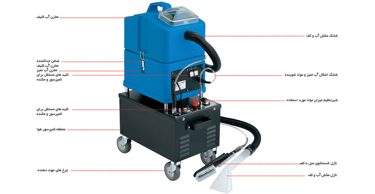 از پمپی که محلول شوینده را با فشار بالا تزریق میکند تا سیستم مکشی که آب کثیف را جمعآوری کرده و از طریق شلنگها به مخازن منتقل میکند، هر قطعه نقش حیاتی خود را ایفا میکند. این هماهنگی دقیق بین تمامی اجزا، تضمین میکند که دستگاه مبل شوی صنعتی با کارایی حداکثری کار کند و فرآیند شستشو و خشک کردن مبلمان به بهترین شکل ممکن و در کمترین زمان انجام پذیرد. همین عملکرد یکپارچه است که مبل شوی صنعتی را به ابزاری مؤثر و ضروری برای نظافت حرفهای مبلمان تبدیل کرده است. در ادامه به معرفی مهمترین اجزای دستگاه مبل شوی صنعتی میپردازیم که عبارتند از:
