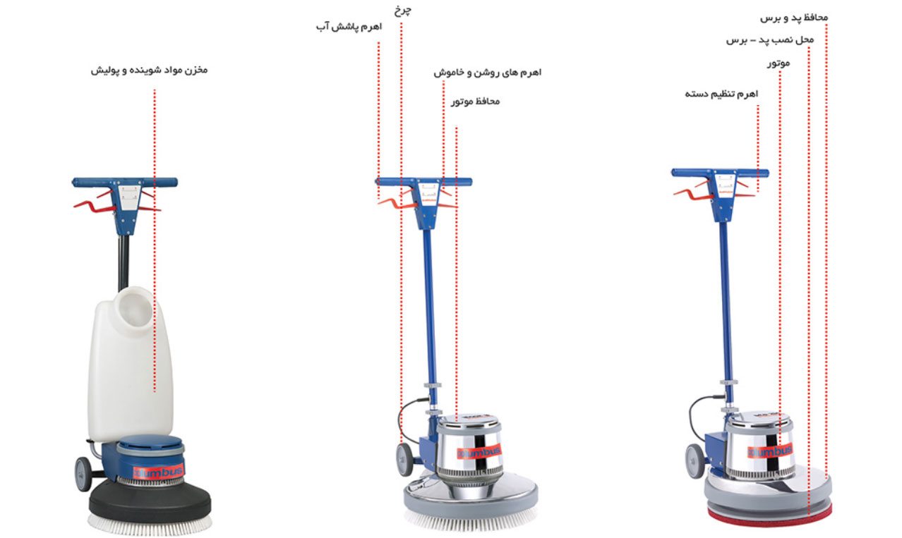 دستگاه پولیشر صنعتی از اجزای مختلفی تشکیل شده است که هر یک نقش مهمی در عملکرد کلی دستگاه ایفا میکنند. این اجزا با همکاری یکدیگر، امکان نظافت عمیق و جلا بخشیدن به سطوح مختلف را فراهم میکنند. اجزای اصلی در اکثر مدلهای پولیشر صنعتی مشابه هستند، اما ممکن است در برخی جزئیات تفاوتهایی داشته باشند. این اجزا عبارتند از: