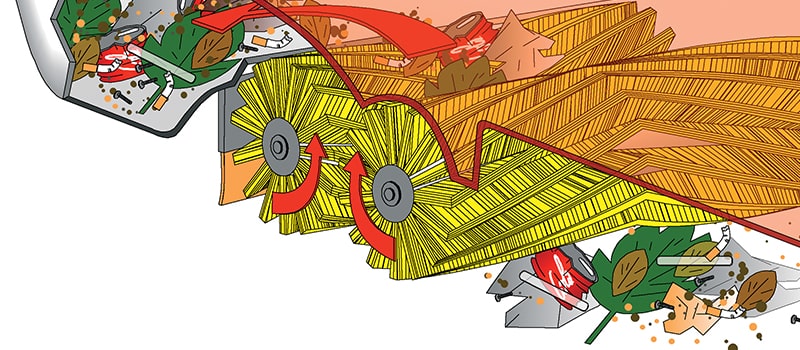 برس هر جاروی شهری متناسب با ویژگی های همان دستگاه طراحی شده و نصب می گردد و بنابراین در اندازه ها و با جنس های متنوع تولید شده اند. الیاف برس سوییپر به طور مستقیم با سطح زمین تماس دارد و بنابراین در صورت عدم رسیدگی به آن با گذشت مدت زمان فرسوده خواهد شد. برس ها در گروه قطعات مصرفی سوییپر شهری قرار می گیرند و بنابراین به سادگی قابل تعویض و حتی قابل رسیدگی می باشد. برس هایی که در کناره های دستگاه جای گرفته اند، آلایند های نواحی غیر قابل دسترس برای برس مرکزی را جمع آوری نموده، به سمت برس مرکزی هدایت می کند و در نهایت به مخزن سوییپر فرو می ریزد. حرکت برس های دیسکی دورانی شکل است و مخالف یکدیگر به سمت داخل دستگاه می چرخد.