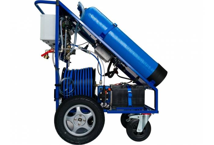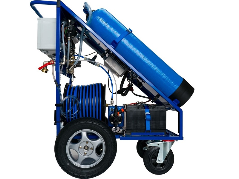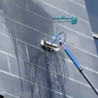 Facade and window cleaning equipment - Qleen Profi is one of the most efficient equipment for cleaning surfaces at high altitude directly from the surface of the Earth. Due to the high power of this model is also used for large surfaces. The ordinary water from the tap and converts it to converts pure and free of salts and minerals.by the strong water filtration unit. This device takes advantages of the properties of pure water, increases quality of washing facade and glass significantly. It cleans any contamination from the surface and does not leave any spot on. This facade cleaning model can use detergent to a better quality of cleaning. This model consists of several sections, including: high capacity filtration system, transportation trolley, battery and charger, lance set, Brush with adjustable angle and Lance bag. This filtration unit of this is larger and more powerful other models and consists of two 25-liter tank filled with resin bed. The device has a powerful pump that can pump water to a height of 21 meters and has a wireless controller. This set has a four-wheeled trolley for ease of movement and battery, charger and collector hose reel are placed on it.  One of the main advantages of this model is the use of rechargeable batteries to power pumps, which can be used in any location. Battery and charger for this device are available. A set of lance to be delivered with device for that it could clean 13.69 meters directly without having to lift off the ground. Cleaning brush has adjustable angles up to 90 degrees and can be used easily. In order to facilitate the handling of Lance, a bag special for holding lance will be delivered with device. It is used to facade cleaning of high building, shopping malls, solar modules and so on.