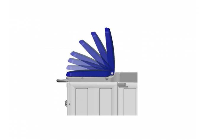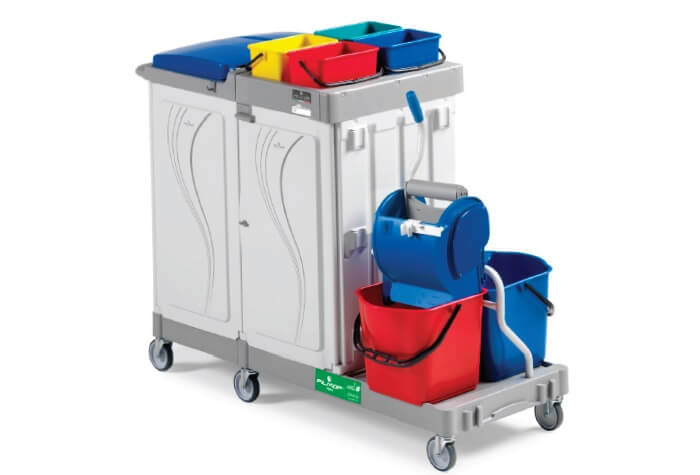 MULTIPURPOSE TROLLEY ALPHA 8104 is used for the general cleaning, dusting, hygiene and professional eluting of different surfaces. It has 2 shock absorbing pistons that cover close soft and silent (Hush System). This trolley includes 2 asymmetric vertical frames, plastic bag support with 2 wheels 100 mm and 150 liter bagholder, bagholder support, plastic central basket, one closing profile for central basket, 3 fixed side walls, four 4 liter buckets, press wringer with wringer support, two 15 liter buckets, sliding drawer.