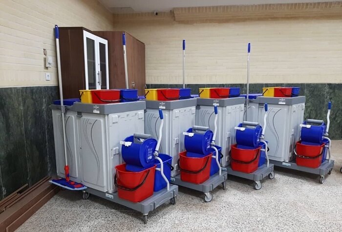The bagholder can be equipped by a kit pedal which allows the opening of the cover by foot, without using the hands. The bagholder is completely closed to improve environmental health and the door helps the operator while emptying the bag from the front. A label exist on the central frame can be customized writing the user's name, the working area or other information. Side closing door has key and hand grip make it easy to open. The fixed side wall and the side door are very smooth, that they can be customized with drawings, pictures or logo. 4 liter buckets are in four different colors to keep the different chemical solutions and the tools and cleaning equipment separately. It is better that detergent solution separate from the rinse water for professional dusting and cleaning, so that it has two 15 liter buckets. The trolley can be equipped with handle holders and other tools.