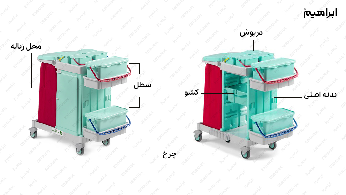 - سطلها: سطلهای مختلفی برای نگهداری آب، مواد شوینده، زباله و ابزار نظافتی مانند جارو، تی و اسفنج تعبیه شدهاند.