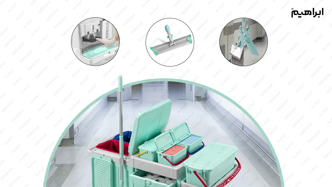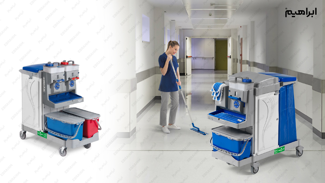 اسفنج و سایر ابزار مورد نیاز برای نظافت است. با استفاده از این ترولی، پرسنل نظافتی میتوانند به راحتی تمامی ابزار و مواد مورد نیاز خود را در یک جا جمعآوری کرده و به سرعت به نقاط مختلف بیمارستان دسترسی پیدا کنند. این امر باعث