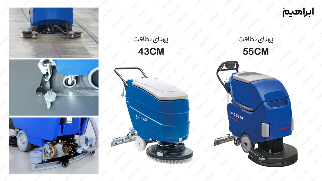 - پهنای شستشو: عرض برس دستگاه های زمین شوی صنعتی ابراهیم، که تعیینکننده پهنای شستشو است، نقش مهمی در سرعت انجام کار و افزایش بهرهوری دارد. اسکرابرهای ابراهیم با عرض های شستشوی متنوعی عرضه میشوند تا پاسخگوی نیازهای متفاوت فضاها باشند.
